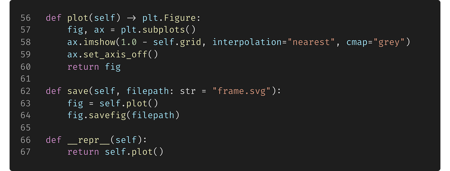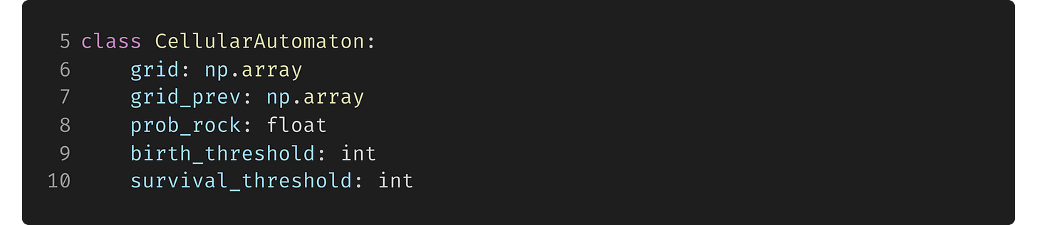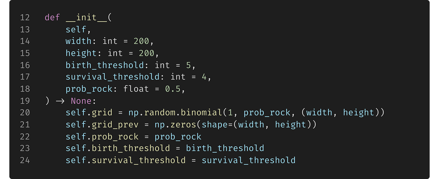 We’ll encapsulate our cellular automaton in a Python class. It needs to store the construction parameters, the grid of cell states, as well as an additional buffer for calculating the next time step: