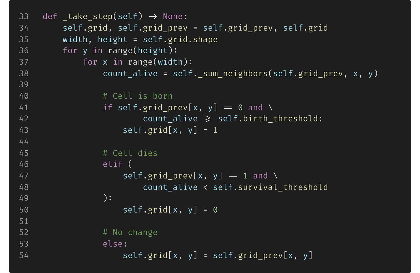 The following method simulates a single time step of the automaton using the rule we previously described. Notice how the values of the next time step only depend on the previous time step, or rather, we update all of the cell values asynchronously: