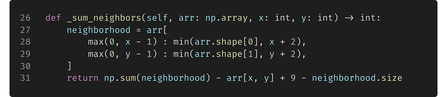 To count the number of neighboring cells that are alive, we take a slice of the array, and use a simple trick to treat out-of-bounds neighbors as alive: